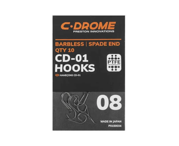 De C-Drome CD-01 Hooks zijn zeer hoogwaardige haken die ideaal zijn voor het vissen op witvis. De haken zijn beschikbaar in verschillende maten. Deze haken zijn goed te gebruiken bij het vissen met een feeder, dobber of andere witvistechniek. De haken zijn weerhaakloos waarmee er rekening wordt gehouden met het welzijn van de vis. De haakpunt van de haken is vlijmscherp en de haakbocht is ruim waardoor de inhaking optimaal zal zijn. De haken beschikken niet over een haakoog. Verder zitten de haken verpakt per 10 stuks. Door de grootte en vorm van de haken zijn deze goed te gebruiken met een groot scala aan haakaas zoals maïs, wormen en pellets.