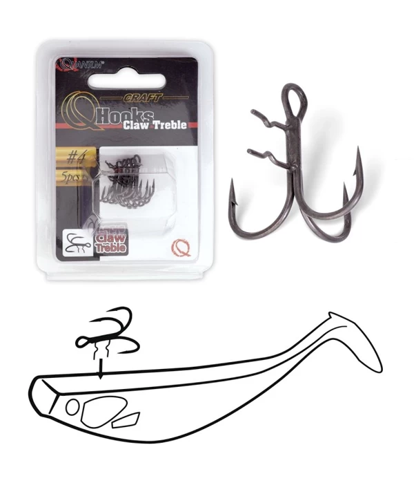 De Quantum Claw Treble Hook is zo gevormd dat ze met haar ‘klauw’ zeer eenvoudig op elk punt in de shad vastgezet kan worden, zonder deze te beschadigen of de actie te beïnvloeden. En het bijzondere hiervan is dat alle drie de haakpunten vrij liggen om de roofvis te haken. Verkrijgbaar in acht haakmaten van 6 tot 4/0.
