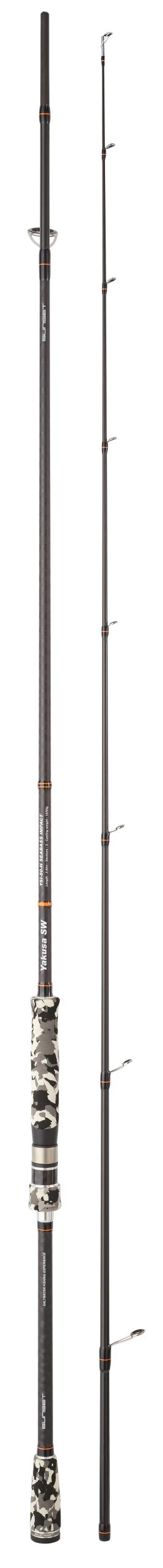 De Yakusa Seabass Impact kunstaas hengels hebben een sterke blank in twee gelijke delen. Ze zijn gemaakt van 24T “Technifibre” carbon en zijn voorzien van een dubbele handgreep in camo EVA-schuim met hoge dichtheid. Tevens heeft de hengel een buisvormige molenhouder van het VSS-type en Seaguide anti-tangle geleideogen. Uitgerust met een dunne en lichte blank, is de Sunset Yakusa Seabass Impact hengel ontworpen voor het vissen met kunstaas vanaf de kust en vanaf de boot. Licht en responsief, de blanks hebben een grote krachtreserve waardoor ze bestand zijn tegen runs van de grootste vissen!